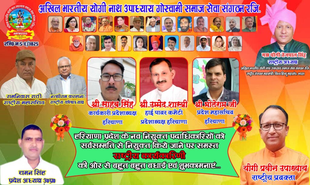 हरियाणा प्रदेश की नव नियुक्त कार्यकारिणी के विस्तार में आदरणीय साहब सिंह जी को अखिल भारतीय योगी नाथ उपाध्याय समाज सेवा संगठन रजि० S-E/1825 का हरियाणा प्रदेश कार्यकारी अध्यक्ष और भोले राम योगी जी, को हरियाणा प्रदेश महासचिव, उमेद सिऐ शास्त्री जी को हरियाणा प्रदेश हाई पावर कमेटी अध्यक्ष नियुक्ति पर बहुत बहुत बधाई ओर‌ शुभकामनाएं